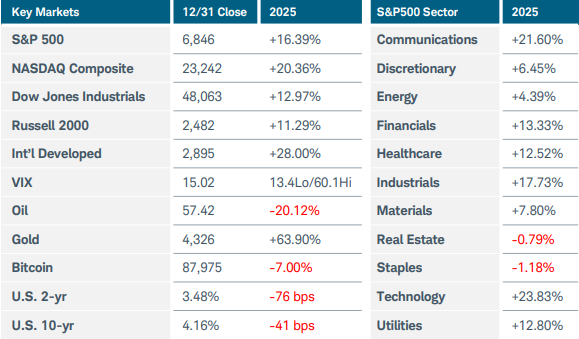 Despite ending on a four-day losing streak, the S&P500 index posted its third consecutive year of above-average returns, rising 16.4% in 2025. The U.S. equity benchmark closed the year within about 1% of its all-time high. The Nasdaq Composite gained 20.4% while the Russell 2000 rose 11.3%. International equities had the strongest performance, with the MSCI EAFE index climbing nearly 28% and the MSCI Emerging Markets jumping over 30%. Volatility as measured by the VIX ended near the lows of the year after spiking above 60 during April’s tariff-induced equity market swoon. Technology and communications were the dominant U.S. sectors, each rising more than 20%. The “Magnificent Seven” tech stocks outperformed, fueled by the allure of artificial intelligence, although some valuation concerns crept in towards year-end given those companies’ massive capex outlays. U.S. Treasury yields trended lower after peaking early in the year while the spread between short-term and long-term rates increased meaningfully. The yield on two-year notes fell 76 basis points to under 3.5% as investors priced in rate cuts from the Federal Reserve. Meanwhile, the 10-year yield finished above 4.15% as GDP growth was solid and inflation expectations remained elevated. In the commodities space, gold and silver rocketed higher, posting their best returns since 1979. Oil prices, however, suffered their worst drawdown since 2020 as multiple threats of supply disruption failed to materialize. Bitcoin’s rollercoaster year ended with the largest cryptocurrency down 7%. A sharp drawdown ensued after prices reached a record high above $127,000 in early October. Turning to year-end economic data, the long-delayed U.S. Q3 GDP data came in at 4.3% growth, well above expectations and surpassing the 3.8% rate from Q2. Consumer spending increased at a robust 3.5% rate while the PCE price index rose 2.8%, still significantly above the Fed’s 2% target. The Congressional Budget Office estimated that the government shutdown could slice one to two percentage points off Q4 GDP but that most of the drop may be recovered in subsequent quarters. U.S. consumer confidence fell for a fifth straight month in December to 89.1 on more pessimistic views of the jobs market. Minutes from the recent FOMC meeting reflected a deeply nuanced debate about U.S. economic risks, with most members ultimately supporting a rate cut given the slowdown in job creation. Overseas, China’s blue-chip CSI300 index gained 18%, its best performance in five years, despite the tariff battles with the U.S. The country’s factory activity ended the year on a positive note, with manufacturing PMI rising to 50.1 in December on a jump in pre-holiday production. President Xi pledged “more proactive” macro policies in 2026 to expand investment and support growth.