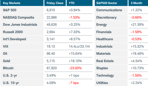 U.S. equity indices gained ground as investors sorted through a slew of economic reports while also weighing the implications of Friday’s Supreme Court decision to strike down President Trump’s sweeping tariffs. The Nasdaq Composite rose 1.5%, while the S&P500 gained 1% and Russell 2000 added 0.6%. Sector performance was split, with gains in financials, communications, and industrials offset by weakness in staples, materials, and healthcare. Private equity companies suffered losses after Blue Owl Capital’s decision to sell $1.4 billion in assets and freeze redemptions at one of its funds. The moves fueled additional worries about lenders’ exposure to certain industries like software. Shares of Walmart fell after the company issued a conservative forecast in its earnings release. In commodities, gold prices edged higher while silver jumped 9% to $84.25. U.S. Treasury yields rose after a mixed batch of economic data. The long-delayed first estimate of Q4 2025 GDP came in much lower than expected at +1.4%, decelerating sharply from the prior quarter’s growth of 4.4%. A pullback in consumer spending and exports, combined with the government shutdown, were cited as the main reasons for the weaker reading. Another delayed report showed that U.S. inflation increased more than expected in December. The Core PCE Price Index rose 0.4% MoM and 3.0% YoY. Minutes from the last FOMC meeting included the first recent mention of potential rate hikes if inflation remains above the 2% target. Policymakers remained split over their next move and fed funds futures currently reflect just over 50% chance of a quarter-point rate cut in June. In other economic news, U.S. business activity continued to expand this month, albeit at a slowing rate. The S&P Global flash Composite PMI slipped to 52.3 from 53.0, with new orders and employment stalling. The final consumer sentiment reading for February slipped to 56.6 from an initial estimate of 57.3, with one-year inflation expectations sitting at 3.4%. The U.S. trade deficit widened in December, leaving the goods shortfall in 2025 at the highest on record despite higher tariffs on foreign merchandise. Finally, pending sales of existing homes fell to a record low in January as buyers retreated despite falling mortgage rates and a slower pace of price increases. Overseas, business growth continued to outpace expectations in Europe, with Germany’s flash composite PMI rising to 53.1 this month from 52.1. The manufacturing component rose above the 50 level that represents expansion for the first time since June 2022. Britain’s inflation rate dropped to 3.0% YoY in January while employment and wage growth figures softened, strengthening the case for a rate cut in March.