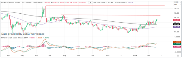 There are few better instant measures of the geopolitical climate than the price of oil. Last week, crude oil futures jumped 5.7% to $66.40 after President Trump warned Iran that an agreement on the country’s nuclear program needs to be reached in the next couple of weeks. The U.S. has deployed a massive military buildup in the Middle East, fueling fears of a wider war developing in the region which produces about a third of the world’s oil. With investors and policymakers hyper-focused on inflation, rising crude prices that lead to more expensive gasoline would be a most unwelcome development. Costs at the pump tend to feed into inflation data quickly and can have a negative impact on consumer sentiment and spending. From a technical perspective, crude oil futures have broken out of a three-week long consolidation range and appear poised to continue their intermediate-term uptrend that began in early January. The 50-day moving average is still below the 200-day but closing the gap, while the MACD indicates bullish momentum. The next technical resistance awaits near $70 with the 52-week high of $78.40 above it. For the most part, oil traders spent the past six months ignoring geopolitical threats that never materialized into actual production disruptions. We may find out soon if the current situation plays out differently.