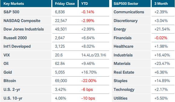 U.S. equity indices fell as fears of disruption from artificial intelligence continued to weigh on investor sentiment, even as economic data suggested that several interest rate cuts are still likely in 2026. The Nasdaq Composite dropped more than 2%, while the S&P500 slid 1.4% and the Russell 2000 ended lower by nearly 1%. At the sector level, financials were hit hardest by the AI turmoil, tumbling 5%, while the rate-sensitive and defensive utilities sector jumped 7%. Gold and silver remained volatile but ended the week little changed, while crude oil slipped more than 1% as U.S.-Iran tensions eased and traders speculated that OPEC may resume output increases soon. A significant slide in U.S. Treasury yields was only briefly interrupted by a stronger-than expected January jobs report. The 10-year yield sank 15 basis points to 4.06% after the inflation outlook improved. Consumer prices rose 0.2% last month, less than forecast. The YoY increased slowed to 2.4% from 2.7%, partially due to past higher readings dropping from the calculation. Delayed retail sales data from December registered an unexpected flat reading, potentially putting consumer spending on a slower growth path heading into 2026. This news, along with the softer CPI report, supported prospects of at least two interest rate cuts from the Federal Reserve this year. However, fed funds futures still pointed towards the first decrease not arriving until June at the earliest. January’s non-farm payrolls increased by 130,000 and the unemployment rate ticked down to 4.3%, backing the Fed’s recent statement that the labor market has shown signs of stabilization. In other U.S. economic news, the New York Fed’s latest Survey of Consumer Expectations saw one-year inflation expectations fall to 3.1% from 3.4% while some concerns about the jobs market abated. The Employment Cost Index slowed unexpectedly in Q4 2025 as softening demand for labor restrained wage gains. Existing home sales last month sank to the lowest level in more than two years. While affordability conditions improved for homebuyers due to wage gains and lower mortgage rates, supply remained constrained and lifted the median existing home price to $396,800. Overseas, Japanese stocks soared to record highs and the yen rallied after Prime Minister Takaichi’s ruling party scored a decisive victory in last weekend’s lower house elections. The result improved chances for economic stimulus measures at the core of the new government’s policy transition. In China, consumer inflation rose less than forecast at 0.2% in January while deflation in producer prices persisted. Last of all, Britain’s economic growth stagnated in the final quarter of 2025, rising just 0.1% and increasing odds for a rate cut in March.