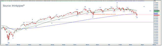 Going into last week, the S&P500 index (SPX) had been essentially flat over the past six months. It first reached $6,550 in September and ultimately ascended to just above $7,000. However, three major pullbacks along the way—in October, November, and this month—brought the index back to around $6,550, marking that area as an important technical support. Applying an Elliott Wave analysis from last April’s low also highlights why that level is important. Currently it appears that SPX may be in the last stage of wave 4, a corrective wave. Interestingly, the April low was a 4th wave of one larger degree, while the November low was a 4th wave of one lesser degree. In each of these cases, it’s important to note the pattern leading into those corrections. Wave 3, an impulse wave moving in the direction of the overall upward trend, pushes higher, eventually losing momentum and dropping in wave 4 before finding support and rallying into wave 5. The most common retracement level for wave 4 to arrive at is the wave 4 of one lesser degree, which in this case was the November low at $6,550. One lesser degree from that was the October low, also at $6,550. If this level holds it would represent a near-textbook corrective sequence, potentially setting wave 5 up to reach new highs. However, SPX closed below support and the 200-day exponential moving average on Friday, and if this critical backstop fails the prospects of a larger drop down to the $6,060 area increase significantly.