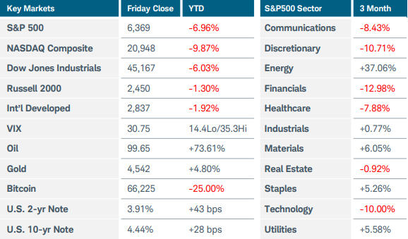 U.S. equity indices sold off sharply at week’s end amid little tangible progress toward ending the war in Iran. The Nasdaq Composite index lost more than 3% while the S&P500 slid 2%. The Russell 2000 fared better, rising marginally. Oil prices continued to drive the narrative: after plunging Monday on hopes for negotiations and de-escalation in the Middle East, crude and Brent futures steadily clawed back losses to finish higher for the week. U.S. sector performance was mixed, with sharp gains in energy (+5%) and basic materials (+4%) offset by weakness in technology (-4%) and communications (-4.5%). The latter were dragged down after Meta and Alphabet were found liable for social media addiction in two separate trials. Rising energy costs pushed the inflation narrative, sending U.S. Treasury yields to eight-month highs. The 10-year note yield jumped as high as 4.48%, up nearly 50 basis points in this month alone. Relatively poor demand at a trio of short- to intermediate-term Treasury auctions also pressured bond prices and contributed to the rise in yields. U.S. mortgage rates rose for a third straight week, with the 30- year contract lifting to 6.43%. Despite President Trump extending the deadline for Iran to reopen the Strait of Hormuz to April 6 and unconfirmed reports of talks between the countries, investors were skeptical and the Cboe Volatility index (VIX) spiked back above 30. Federal Reserve officials expressed growing concern over the economic outlook and inflation impacts. Turning to economic data, the costs of war started to become evident in this month’s S&P Global Flash PMI surveys. U.S. business activity stayed in expansion territory but slowed to an 11-month low, while prices paid for inputs and output prices charged to consumers both rose. U.S. import prices increased 0.5% MoM in February, the largest jump in nearly four years. The final reading of consumer sentiment for March dropped to 53.3 and one-year inflation expectations rose to 3.8% from 3.4% in the initial estimate. Overseas, private sector growth in the UK and Eurozone stalled this month as manufacturers’ input costs surged, leading them to raise prices at the fastest pace in nearly a year. ECB President Lagarde warned that the central bank could respond “forcefully” should inflation appear likely to persist above the 2% target for an extended period. The Bank of Japan released a new measure of its core consumer price index that showed a 2.2% YoY rise in February. Minutes from the central bank’s January meeting revealed a hawkish bias even before the Iran war jolted oil prices. Finally, China started multiple investigations into U.S. trade practices in response to similar inquiries initiated by the U.S. earlier this month.