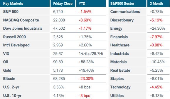 The sudden outbreak of war in the Middle East has changed everything. Artificial intelligence, private credit, and other concerns took a back seat as investors were consumed by skyrocketing energy prices and a sharp rise in both volatility and interest rates. President Trump’s demand for Iran’s “unconditional surrender” suggested that a swift end to hostilities may prove difficult. Qatar’s energy minister said that producers may need to invoke force majeure, which could shut down production and send oil and gas prices even higher. The conflict also puts the Federal Reserve in a tough spot, attempting to balance the impact of last week’s surprise decline in payrolls—which could lead to a drop in economic growth—against the potential that inflation could spike. While traders still think the Fed will not adjust rates at the March or April meetings, odds for a cut at the June gathering crept back above 50% after the weak jobs report. This week’s U.S. economic data is focused on inflation, with February CPI arriving on Wednesday followed by the delayed January PCE price index on Friday. Both readings are expected to be steady compared to prior levels but still higher than the Fed would prefer and now vulnerable to increases in the coming months. There are 10- and 30-year Treasury auctions this week along with housing data, the second estimate of Q4 2025 GDP, and this month’s preliminary consumer sentiment reading. Oracle will report quarterly earnings after market close on Tuesday. The international calendar features China’s inflation update and monthly GDP figures from the UK.